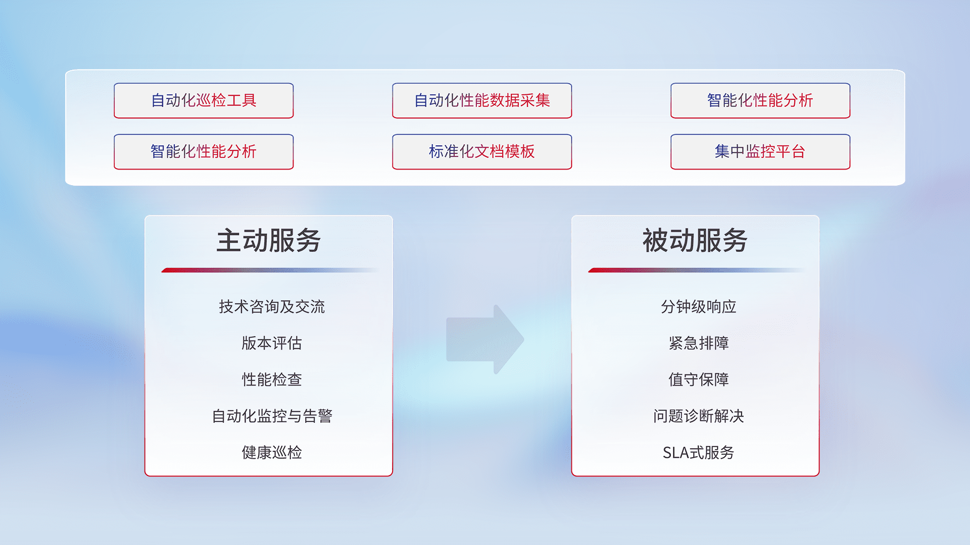 智能化工具和标准化文档,,,,保障服务质量,,,,提供主动服务(包含技术咨询、、、、版本评估、、、性能检查、、、自动化监控与告警、、、、健康巡检)和被动服务包含(分钟级响应、、、、紧急排障、、、值守保障、、、、问题诊断解决、、、、SLA服务)。。。