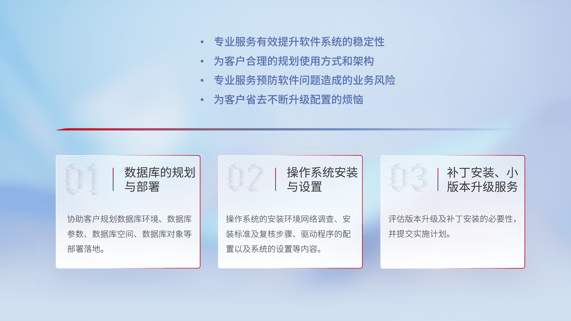 为客户提供软件规模升级、、快速部署、、、按需配置的专业服务,,,,从数据库的规划与部署到操作系统的安装与设置,,,,再到补丁安装和小版本升级提供支持。。。